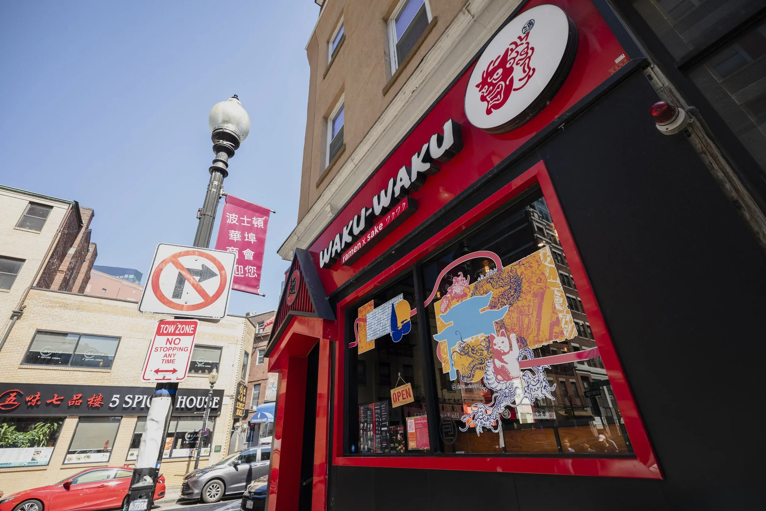 The Experience Chinatown Festival is an annual two-month-long event that celebrates the rich cultural fabric of the titular Boston neighborhood. Mural installations are a core part of the experience, pairing local artists with local businesses to create artwork that adorns storefront windows. The goals are to bring more liveliness to the community, attract business, and combat anti-Asian discrimination. For 2024’s celebration, I was selected as one of the mural designers and created the work Connected by Fate for WakuWaku Ramen.